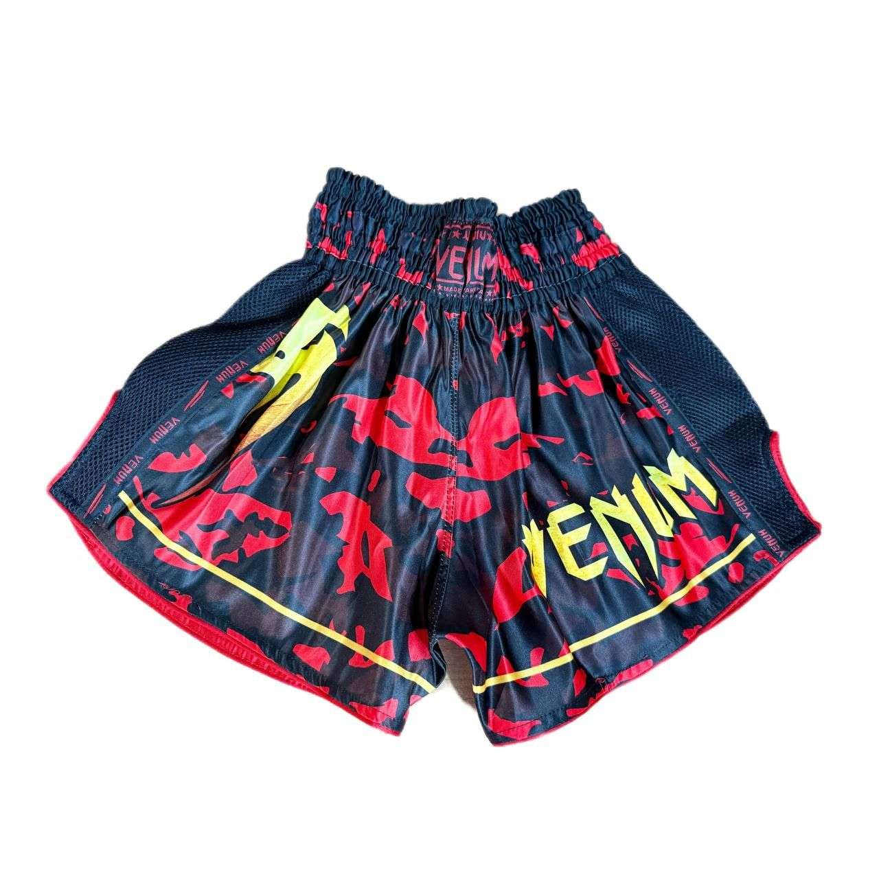 این شورت برای ورزش مویتای طراحی شده و توسط برند Venum تولید شده که یکی از برندهای معتبر در زمینه پوشاک هنرهای رزمی است. طراحی آن به شکلی انجام شده که ورزشکار بتواند با آزادی کامل حرکات لازم مانند ضربات پا، زانو و لگدهای چرخشی را اجرا کند. ویژگیها جنس پارچه سبک، مقاوم و دارای خاصیت خشکشوندگی سریع دوخت تقویتشده در بخشهایی که بیشترین تحرک دارند، مانند قسمت داخلی پا طراحی کوتاه با شکافهای جانبی برای افزایش دامنه حرکت رنگ قرمز با چاپ گرافیکی و لوگوی برند Venum این شورت برای استفاده در تمرینات، رقابتها و ورزشهای رزمی مشابه مانند کیکبوکسینگ و MMA مناسب